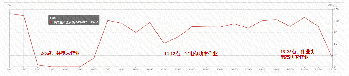 在設備數(shù)據(jù)、能耗數(shù)據(jù)透明化的基礎上,借助平臺數(shù)據(jù)分析,在重點能耗產(chǎn)線,銀輪力推“避峰就谷”的作業(yè)方式。避峰就谷就是不改變作業(yè)時間的基礎上,盡量保障優(yōu)先在谷電平點時間用電,如果谷電平點時間不足,那么就在峰電,如果峰電時間還不夠就在尖電時間用電,以此類推。