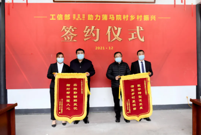 在蒲馬院村村委會舉行的工信部助力蒲馬院村鄉(xiāng)村振興簽約儀式上,工信部機關服務局相關負責人與蒲馬院村相關負責人共同簽訂了扶貧采購協(xié)議,蒲馬院村代表向工信部代表敬獻了錦旗:“數(shù)字轉型促發(fā)展,情系鄉(xiāng)村顯擔當“。