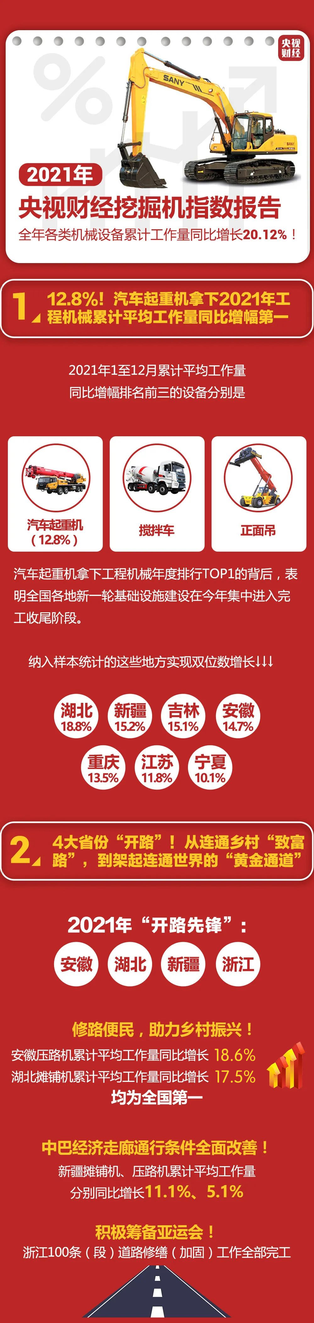 2021年我國持續(xù)加大基礎(chǔ)設(shè)施建設(shè)力度,為社會(huì)經(jīng)濟(jì)發(fā)展注入強(qiáng)勁動(dòng)力。央視財(cái)經(jīng)挖掘機(jī)指數(shù)顯示,2021年我國各類工程機(jī)械設(shè)備累計(jì)工作量同比增長(zhǎng)20.12%!