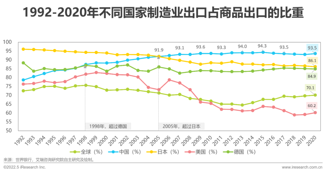 從世界銀行公布的制造業出口數據來看,中國制造業出口占商品出口的比重(以下簡稱制造業出口)從1992年開始,就已經超過全球、美國,并于1998年超過德國、2005年與日本持平。從2006年開始,中國制造業出口一直維持第一的位置,是當之無愧的制造業生產及出口大國。2020年,中國、日本、德國制造業出口分別為93.5%86.1%84.9%,中國的制造業出口優勢依然比較明顯。