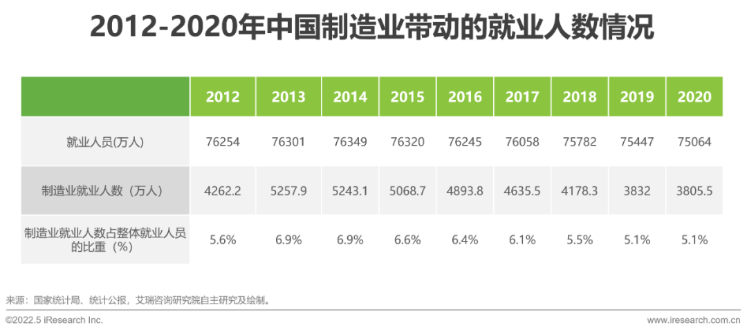 由國家統計局公布的數據來看,2020年,全國就業人員7.5億人,其中,制造業就業人員為3805.5萬人,占比為5.1%。縱觀近10年制造業的就業人員情況,制造業企業帶動的就業人員基本維持在6%左右,對國內就業市場的穩定貢獻功不可沒。