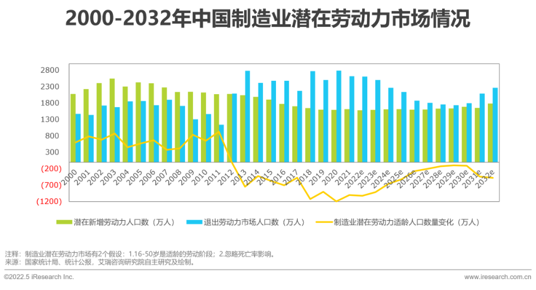 針對制造潛在勞動力市場:2012年開始,中國制造業的潛在勞動力適齡人口數量變化(即潛在新增勞動力人口數與退出勞動力市場人口數之差)為負數,持續到2021年底,制造業潛在勞動力市場平均每年減少700萬左右的適齡人口,并且制造業潛在勞動力市場的適齡人口將持續減少的現象或將維持10年以上,帶來的影響可能就是行業潛在勞動力不足或者制造業企業需要提供更具吸引力的工作環境、工作福利等來吸引年輕群體。