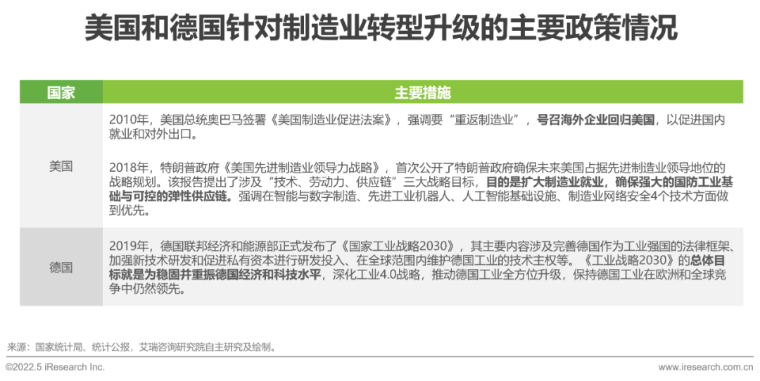 發達國家紛紛出臺政策引導制造業回流并轉型升級,如美國和德國。美國奧巴馬政府和特朗普政府都出臺相關政策表示要重返制造業,同時,還強調要在技術、供應鏈等方面發力,確保美國占據先進制造業的領導地位。德國則在2019年就提出《國家工業戰略2030》,并在次年將工業4.0升級為全國戰略,旨在保證就業的同時,要在全球范圍內維護德國工業的技術主權、保持德國工業在歐洲和全球競爭中的領先地位、轉型升級為智能制造。