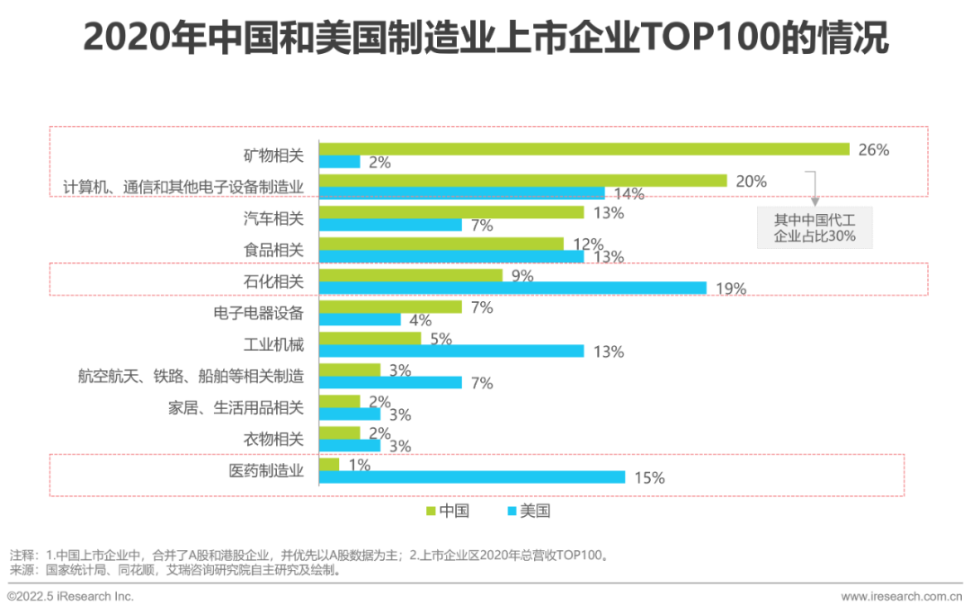 對比2020年中國和美國營收TOP100的制造業上市企業數據,中國的制造業企業更為集中,礦物相關(26%計算機、通信和電子設備制造業(20%汽車相關(13%TOP3大類,占比之和達59%。值得注意的是,計算機、通信和電子設備制造業中,以代工為主的企業占比30%,這也側面說明中國的制造業缺少核心技術。反觀美國,石化相關醫藥制造業計算機、通信和電子設備制造業TOP3大類,占比之和為48%,其產業結構更為分散。