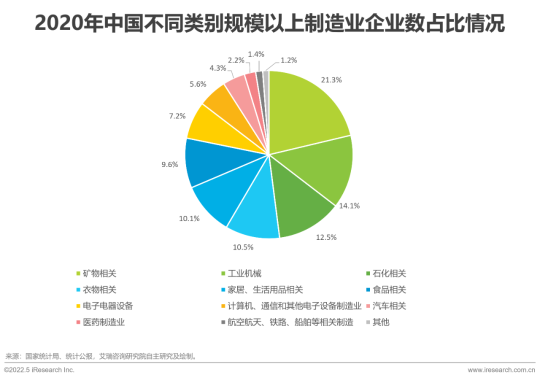 根據國家統計局發布的數據,礦物相關、工業機械、石化相關是2020年不同類別規模以上制造業企業數的TOP3,其占比總和達48%,其中礦物相關占比最高,占比為21.3%,中國的制造業整體偏向資源導向型。