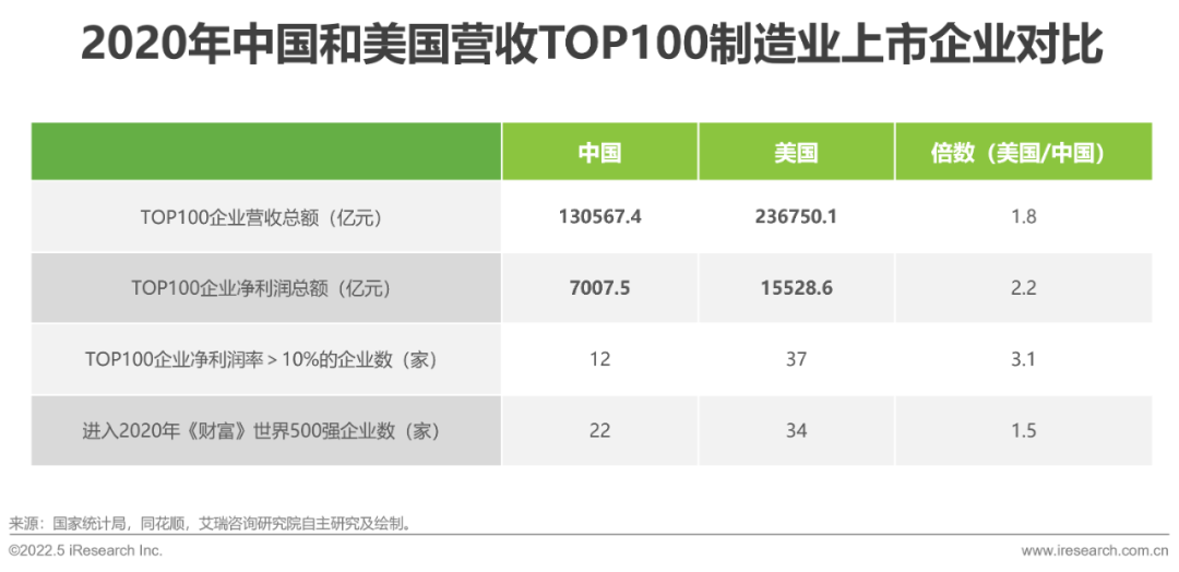 對比2020年中國和美國營收TOP100制造業上市企業數據,美國制造業企業凈利率超過10%的企業有37家,是中國的3.1倍。整體來看,美國制造業企業在營收總額、凈利潤等方面更具優勢。通過將2020年中國和美國營收TOP100制造業上市企業與2020年《財富》發布的世界500強名單對比發現,美國有34家世界500強制造業上市企業,而中國只有22家,美國的制造業企業知名品牌更多。