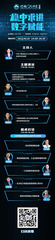 619日下午,由全國工商聯主辦的第四十八期德勝門大講堂將在線上播出。屆時,樹根科技股份有限公司聯合創始人、CEO賀東東等相關專家、學者、企業家將圍繞穩中求進 數字賦能主題,凝聚思想共識,分享成功經驗,探索轉型路徑,為民營企業數字化轉型提供參考和借鑒,敬請期待。
