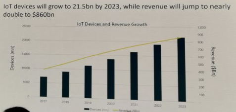 在主題演講之前,分析咨詢機構Ovum IoT Practice負責人Alexandra Rehak與咨詢公司Heavy Reading IoT高級分析師Steve Bell共同分享了 IoT研究的一些數(shù)據(jù), 據(jù)公布的預測數(shù)據(jù),到2023年,全球聯(lián)網(wǎng)的IoT設備會達到230億,同時IoT的營收會躍升到8600億美元!增速驚人!