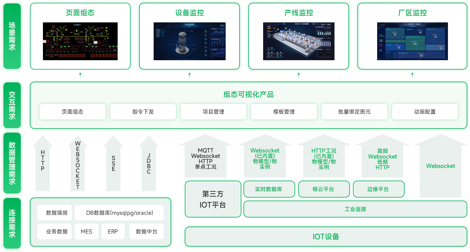 支持 MQTT、WebSocket、HTTP、數據庫等協議,兼容 IOT 平臺與第三方系統。