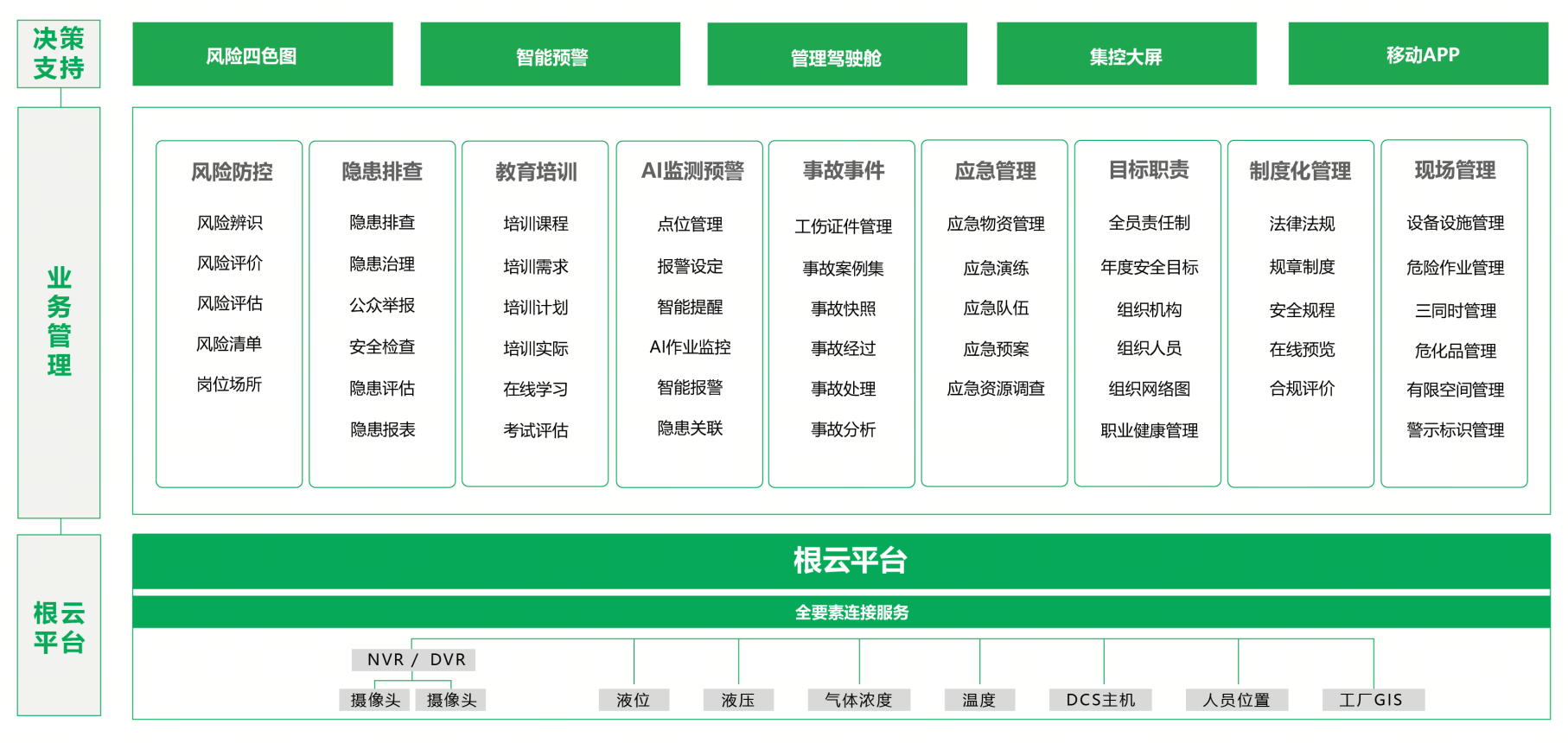 應用工業互聯網平臺實現安全風險監測預警、落實安全生產法,實現企業風險分級和隱患排查管理,即雙控管理,還涵蓋管理駕駛艙、安全培訓考試、云安全知識庫、違規行為AI識別等功能。